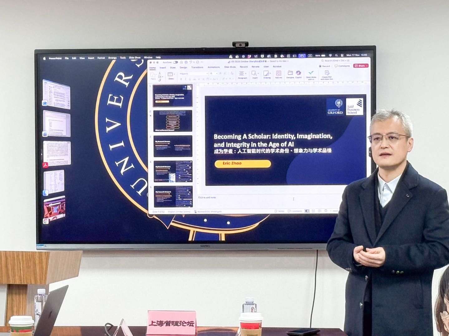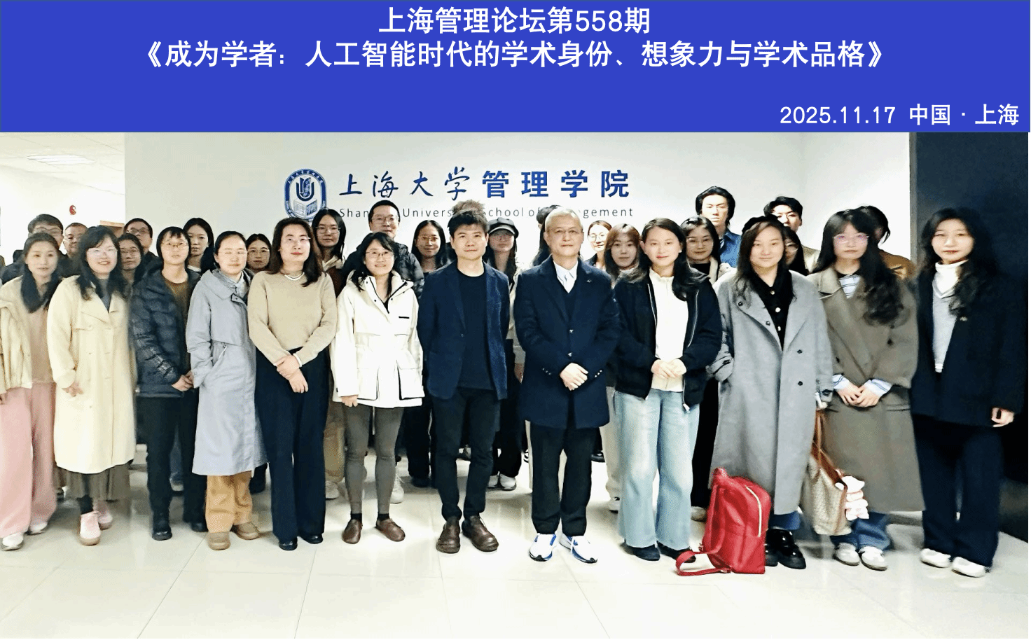 2025年11月17日,上海管理论坛第558期学术讲座《成为学者:人工智能时代的学术身份、想象力与学术品格》在校本部东区管理学院 420 举行。主讲人为来自英国牛津大学赛德商学院的赵雁飞教授,讲座由上海大学管理学院副院长于晓宇教授主持。上海大学管理学院赵玉洁教授,上海大学悉尼工商学院工商管理系主任邹海亮副教授,上海大学管理学院工商管理系副主任贾迎亚副教授,上海大学管理学院杜颖洁副教授、薛奕曦副教授、韩宏稳副教授、余玲玲讲师,上海大学管理学院何琳博士后,以及上海大学的博士生、硕士生、MBA中心校友及学生参加了本次讲座。