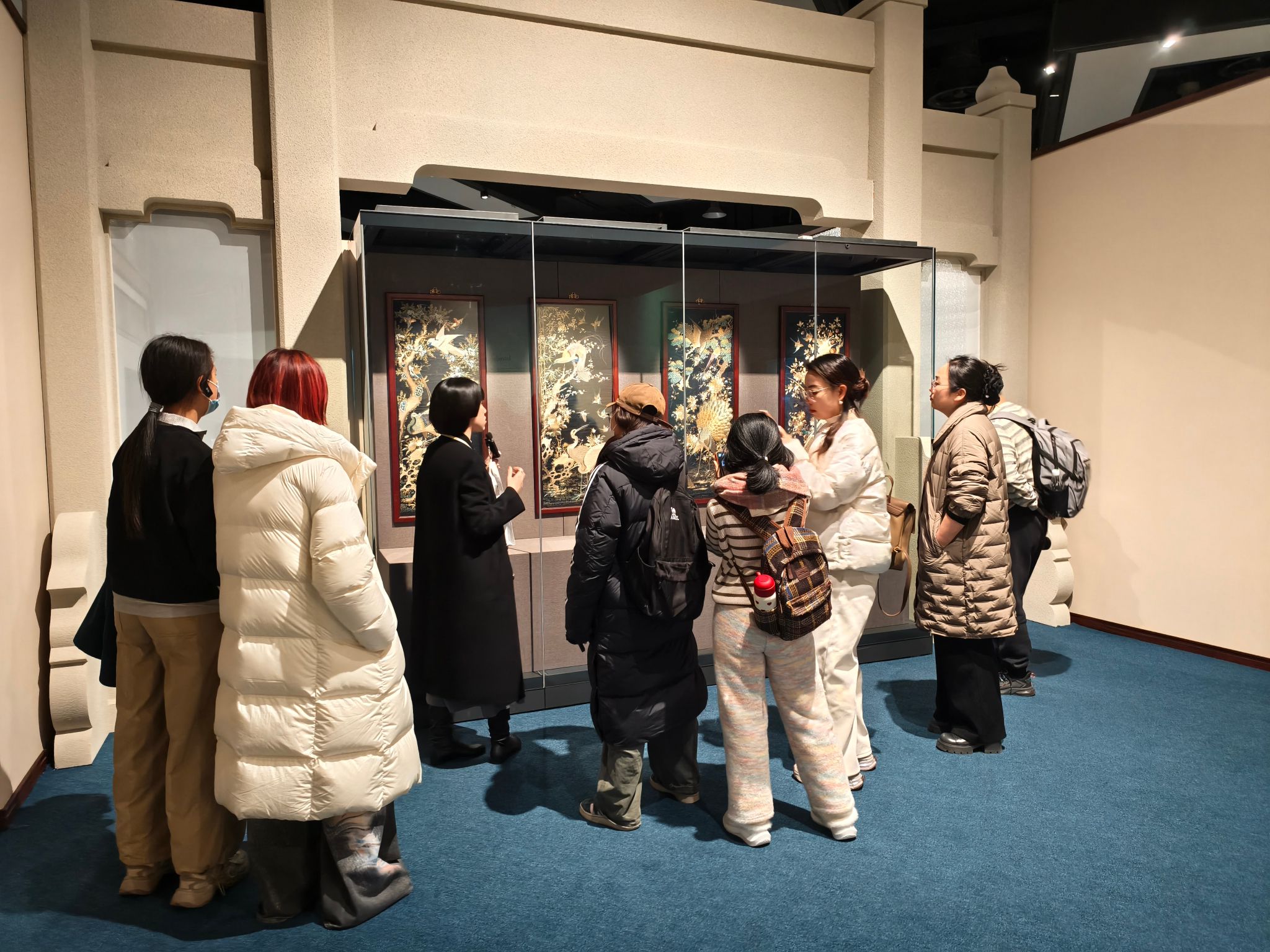随后,师生们还特别参观了临展厅“异趣同辉:清代外销艺术珍品展”。精美绝伦的清代外销刺绣、珐琅、瓷器等展品,生动展示了清代中外贸易与文化交流的状况,让同学们对历史上东西方文明的对话与融合有了具体感知,进一步理解了文明交流互鉴的历史脉络与现实意义。