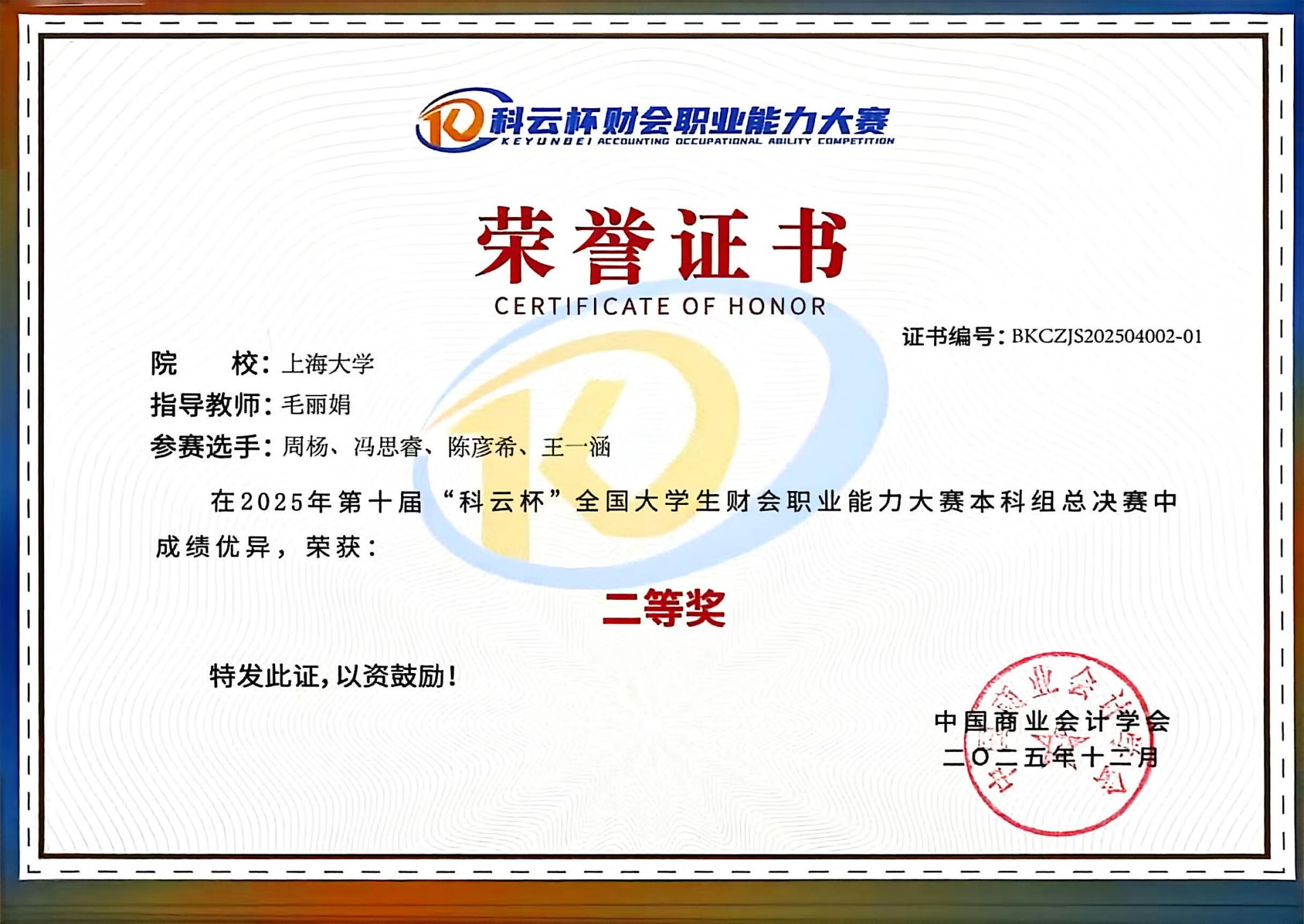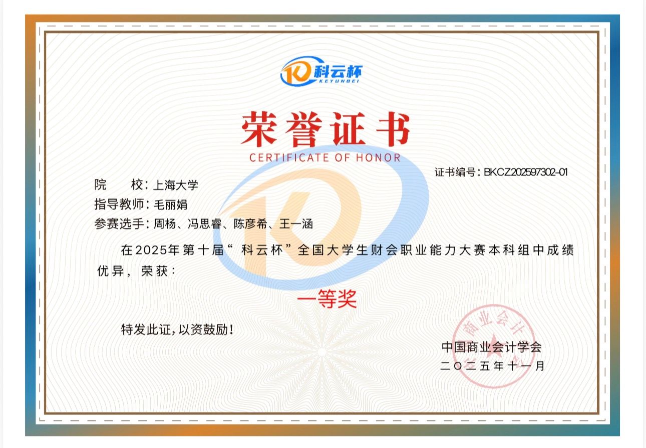 在2025年第十届“科云杯”全国大学生财会职业能力大赛中,上海大学管理学院周杨、冯思睿、陈彦希、王一涵四位同学组成的参赛团队,凭借扎实的专业功底、默契的团队协作与前沿的数智化应用能力,从全国数百所高校的数千支队伍中脱颖而出,斩获总决赛二等奖及市赛一等奖的佳绩!这一佳绩既是团队深耕财会领域、以赛促学的丰硕成果,更是管理学院践行“赛教融合”育人理念、培养复合型财经人才的生动彰显。