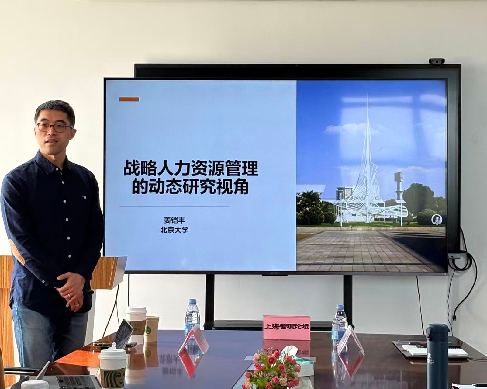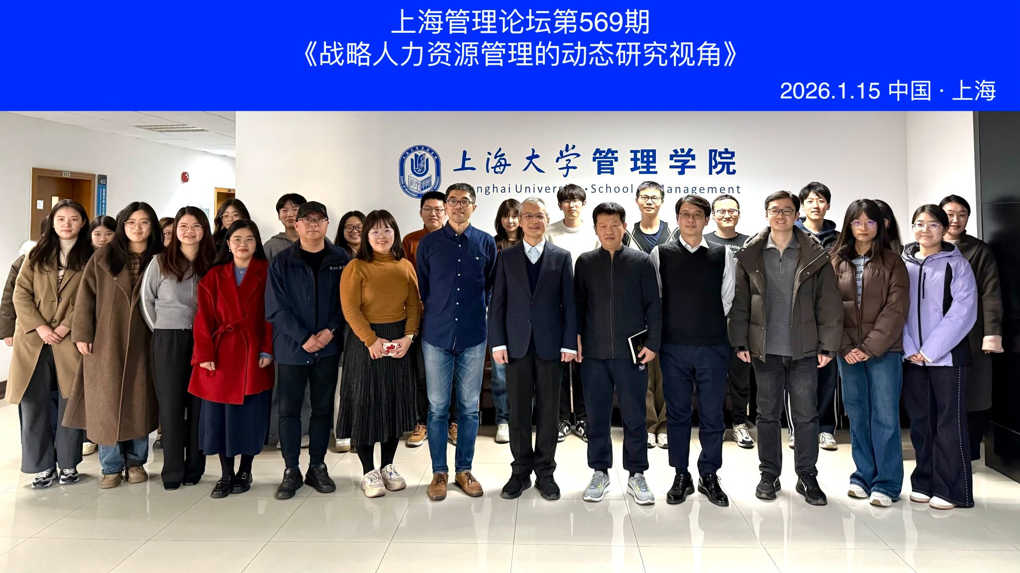 2026年1月15日,上海管理论坛第569期学术讲座《战略人力资源管理的动态研究视角》在校本部东区管理学院420举行。主讲人为来自北京大学光华管理学院的姜铠丰教授,讲座由上海大学管理学院副院长于晓宇教授主持。管理学院马君教授、薛奕曦教授、曹玉红副教授、贾迎亚副教授、刘一蕙老师、周琼瑶老师、吴栋栋老师、杨雯渊老师、王永老师、何琳博士后、李晓琳博士后、卢青云博士后,华东师范大学王振源教授,上海对外经贸大学孟晓彤老师,以及博士生、硕士生等参加了本次讲座。